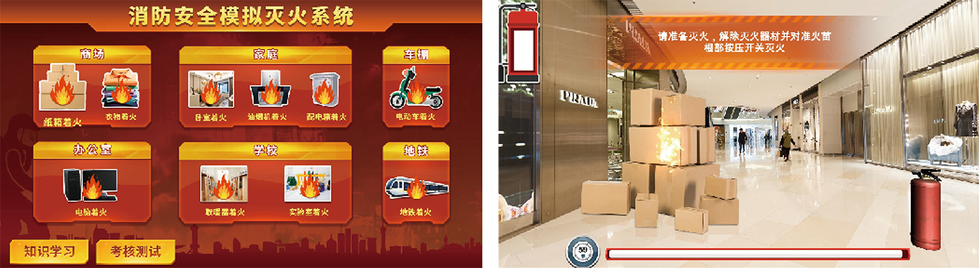 滅火器內(nèi)含傳感器,體驗(yàn)者通過(guò)真實(shí)拿起滅火器并進(jìn)行使用的動(dòng)作,進(jìn)行虛擬滅火的操作。系統(tǒng)提供不同的著火場(chǎng)景,體驗(yàn)者可選擇不同的滅火器,從而熟知使用滅火器進(jìn)行滅火的步驟,系統(tǒng)會(huì)對(duì)體驗(yàn)者的操作進(jìn)行評(píng)分和錯(cuò)誤糾正。